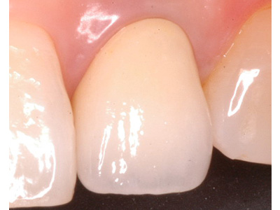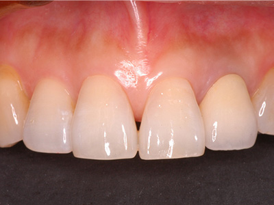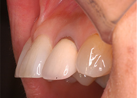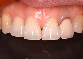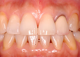 | 治療内容 | 20代女性 左上側切歯の冠周囲の変色を主訴に来院された方に、除去を行い、ファイバーコアにて築造した後、セラミック冠を装着した。 |