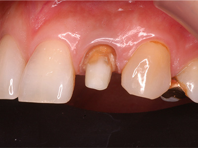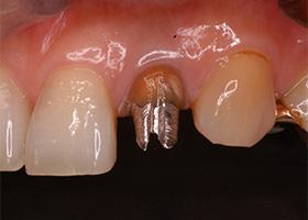 土台の金属を除去し、強度と色調を兼ね備えたファイバーコアを装着し、歯肉が健康な状態に改善した状態です。