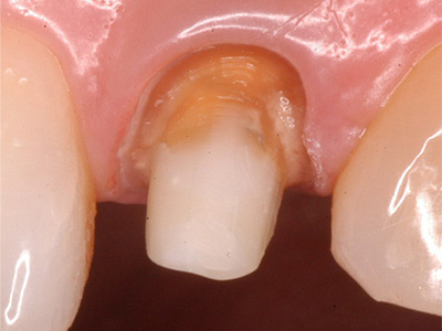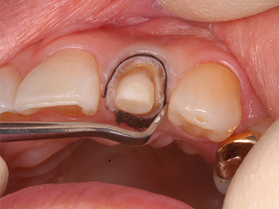 不適合な被せを除去したところ、土台から溶出した金属イオンが原因で、歯が変色していました。