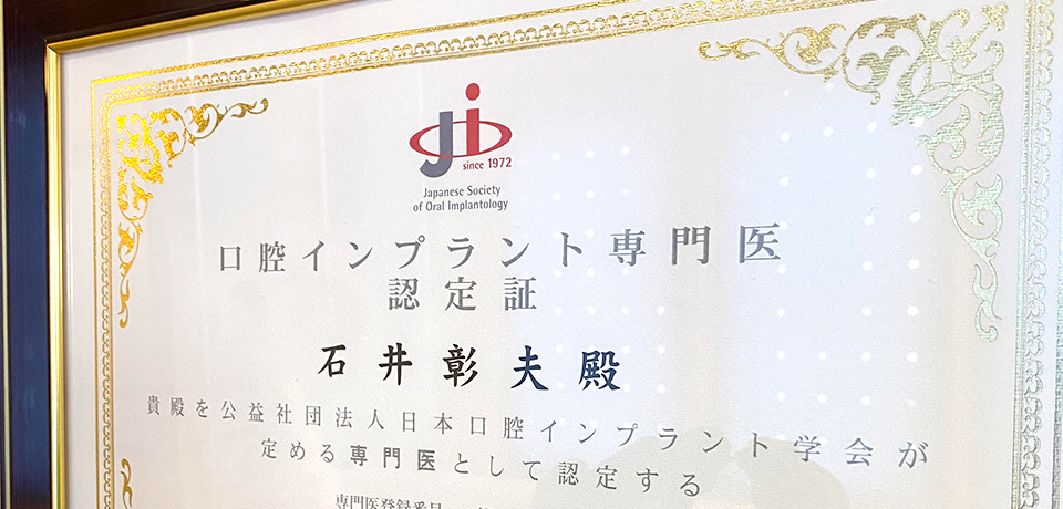 インプラントは施術歴25年を超えていて4,000本以上の埋入実績を持ち、日本口腔インプラント学会専門医の資格を取得。矯正についてはJTSD認定医として、また咬み合わせの分野では日本顎咬合学会認定医として、それぞれ高度な専門性を持って診療にあたっています。